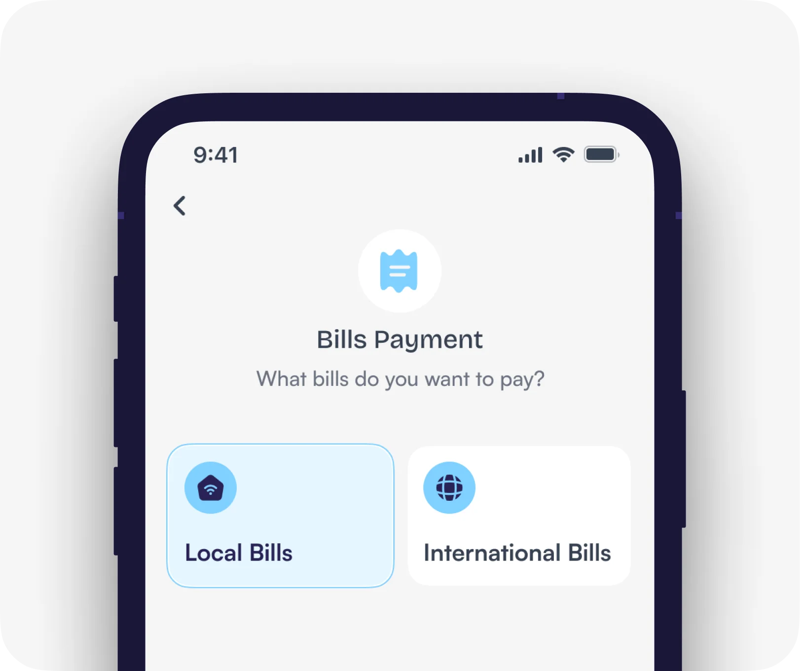 Go to Bills on your dashboard, choose Local Bills, then select the type of bill you want to pay. Input the required details and tap Continue to complete your payment.