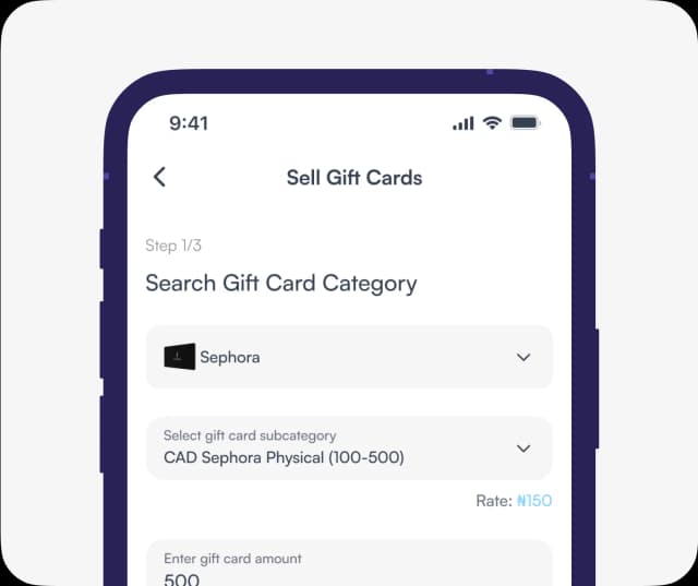 Nosh is your go-to platform to exchange Sephora gift cards for naira. It's reliable by a great number of users in Nigeria. Log in to the app, select "Sell Gift Card", select naira as your currency payout, and upload your Sephora gift card image.
