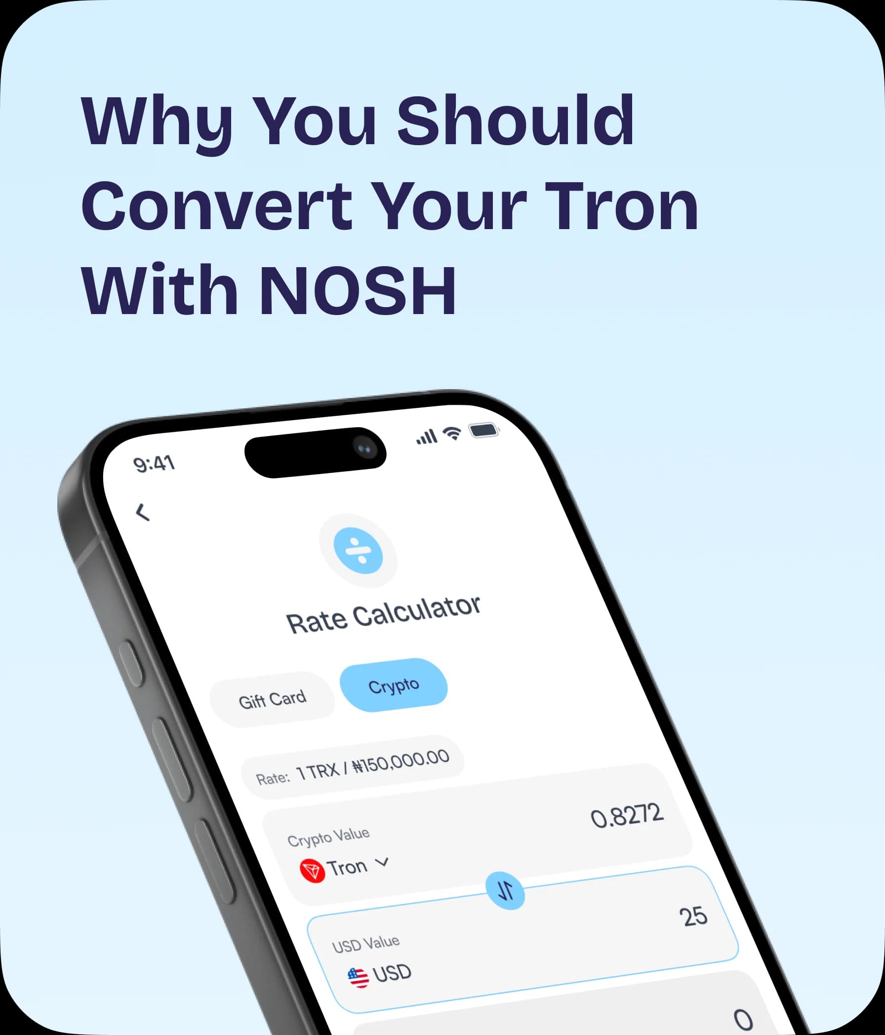Nosh allows you to convert your BTC, LTC, DOGE, USDT (Tether), Tron (TRX), ETH, BNB, and USDC to Naira or Cedis.